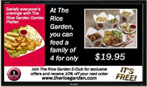 To support this, banner advertising can be purchased on web sites which the content and demographics match The Rice Garden’s clientele.  The banner ads can offer a link to a “Coupons” page on the Rice Garden web site.  The click-through can improve SEO and individual store sales.